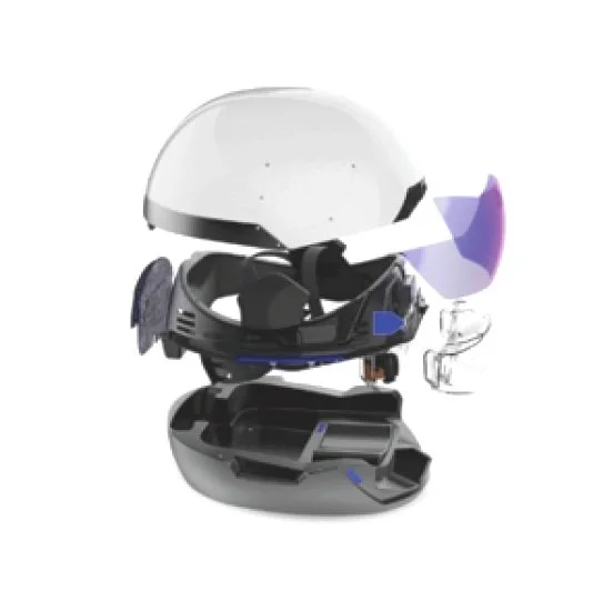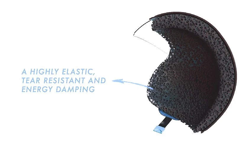 The use of Voronoi geometry in the helmet's design allows for a more efficient and safer airflow, reducing the risk of overheating and increasing the wearer's comfort. The structure created by Voronoi patterns provides a good balance between structural strength and material efficiency. By printing the foam component using 3D printing technology, it allows for a more precise and customized fit for the wearer's head, providing better protection against concussions and other head injuries. Additionally, the use of a carbon-infused polymer in the foam and the chitochin-keratine shell provides additional safety and sanitation benefits by reducing the risk of bacterial growth and transmission of diseases.